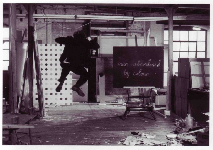 Man Abandoned shows the artist, back to camera, jumping like an ape beside a free standing blackboard on which the title is written in Magritte’s hand [from The Treachery of Images]. Hints of silent-era comedy compete with art historical reference and a foregrounding of ‘background’; the slightly abject studio stacked with work. This particular studio was shared with Damien Hirst; an early spot painting leans behind an iron pillar and ladder. So there you have Angus Fairhurst. Except that there’s more: the building and artist are gone, that ‘background’ has become art historical, the image has gained new dimensions. Between this and Fairhurst’s final series of paintings is a paradigm shift and circular arc: a spiralling of potential.