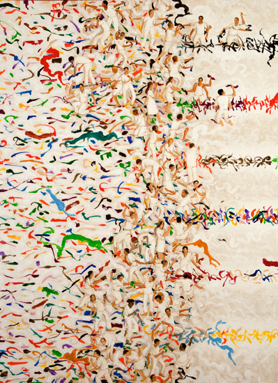 Untitled is Harsha at his best; a broad philosophical insistence rendered as gently as possible and more characteristic of his body of work. This huge mural on canvas divides in half; on the left are a mass of painterly gestures, scraps of colourful fabric, unordered or unformed, individual, intensely vibrant. On the right they’ve been woven together into something strong, useful, evidence of human presence. Rendered at many angles in the muddied middle are busy human beings turning the scraps into thread. Collecting, gathering, weaving, moulding, working up the disparate into something with collective strength. Something formed. This is enough; there’s no manifesto delimiting what that collectivity, strength, humanity or purpose ought to be but no baulking at the absolute necessity for it.