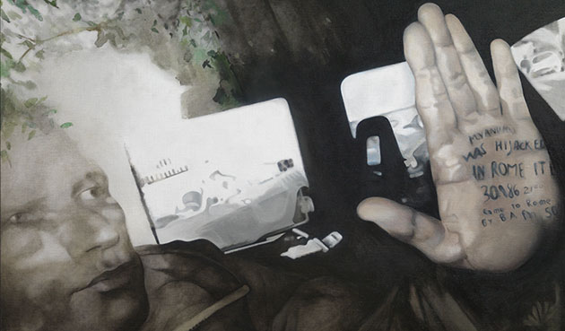 AK is showing four large new paintings which mark a stylistic development on previous work, showcased in a retrospective at the surprisingly capacious Pumphouse Gallery in 2008. IQ is showing six small paintings from his Moderate Enlightenment series; complex portraits of his wife, self, gallerist and studio assistant. In truth it’s a frustratingly small selection, given that both artists deserve the attention that a gallery like the Serpentine can give their work individually. I’m counting the days until it catches up, but quietly dreading some kind of ‘Pakistani Byway’ confection instead.