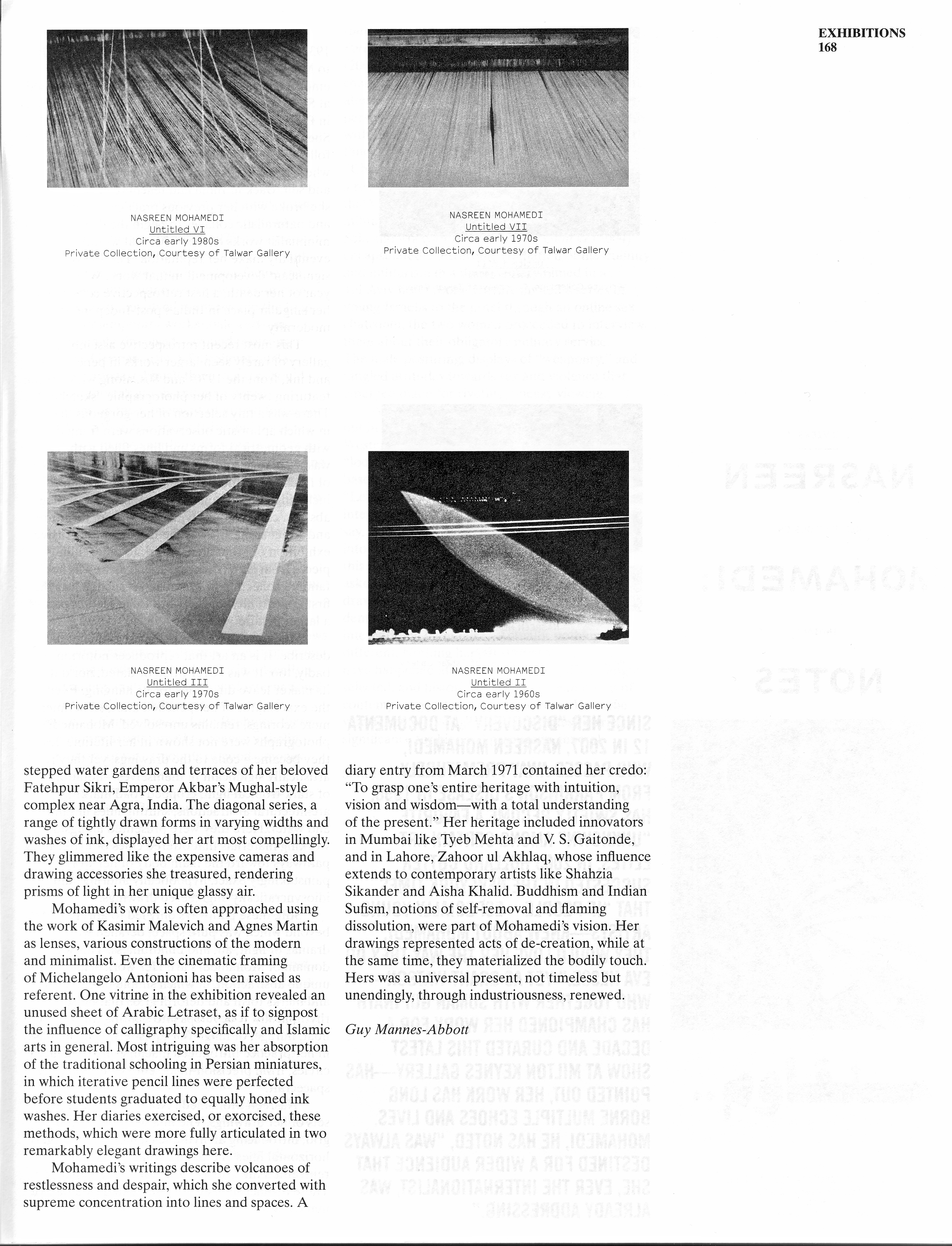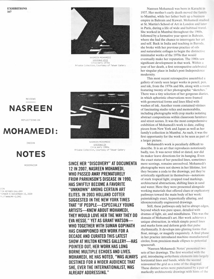 A previous post on Mohamedi referred to my catalogue text from 2001. Now I’m posting my short review of her recent retrospective exhibition as it appeared in the UK. I was pleased and proud to write something on a show that went almost unnoticed -and was certainly not engaged with- in the UK [again], but there’s much more to be written about her work and its contexts.