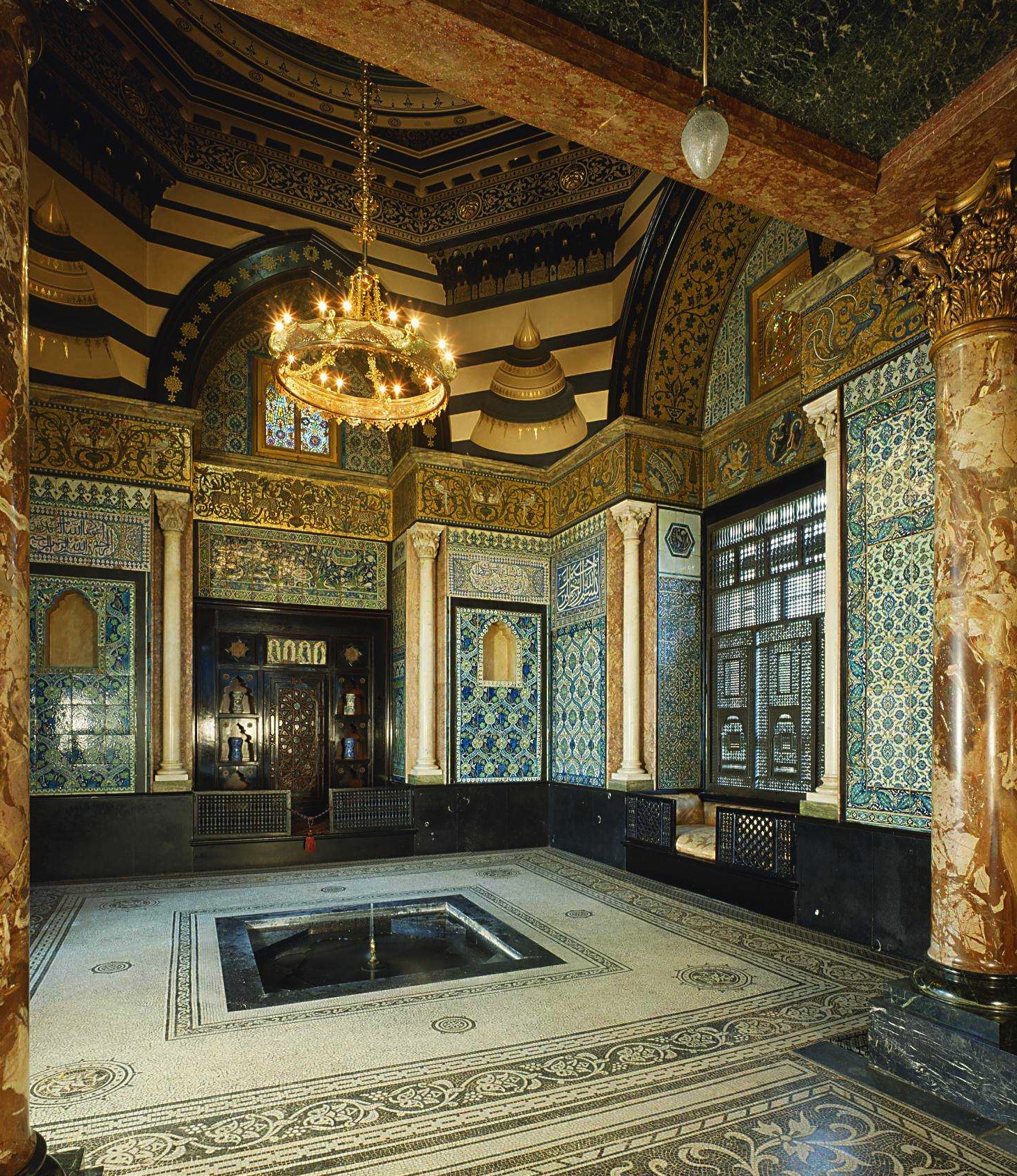 This time I asked myself whether I liked the sound and air of running water inside a building with great ceiling height beneath a dome? The kind of light left by intricately carved screens, the kind of aural environment created by tiled walls and stone floors, the beckoning of gorgeously upholstered cushions, low seats etc. Would it be a good thing if more buildings were dressed in ways of this kind in London? Would it be a happier city if the air that wafted in through the screen was hot/tropical? And then I cut it -even Leighton himself; he of the problematic but to some degree discerning taste- some slack. [CLICK on image for high res one]