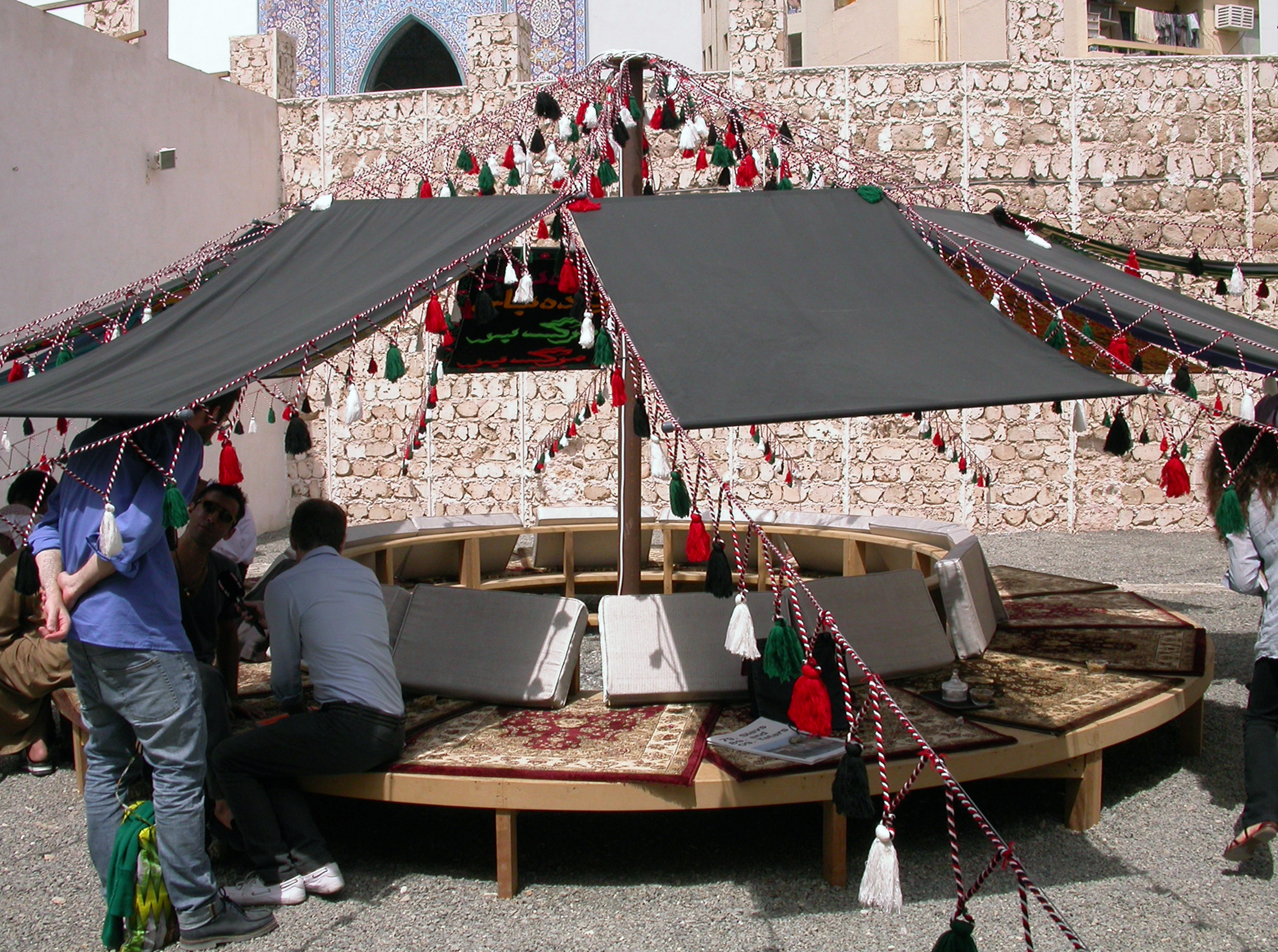 In the courtyard is a be-tented chill-out zone, where tea and mulberries are served alongside another notably well-filled publication. As apparently cosy and even cynical as this appears, a characteristic witty opacity -of the radical passivity kind- reigns in images attached to the underside of the tent. I’m sat -perhaps appropriately- underneath one that reads BEWARE THE ANTI-IMPERIALIST IMPERIALIST. However I’m pretty sure that the two men with whom I exchanged elemental Arabic greetings with, are not perceiving the text or its warning as something legible -which might be worth a consideration?