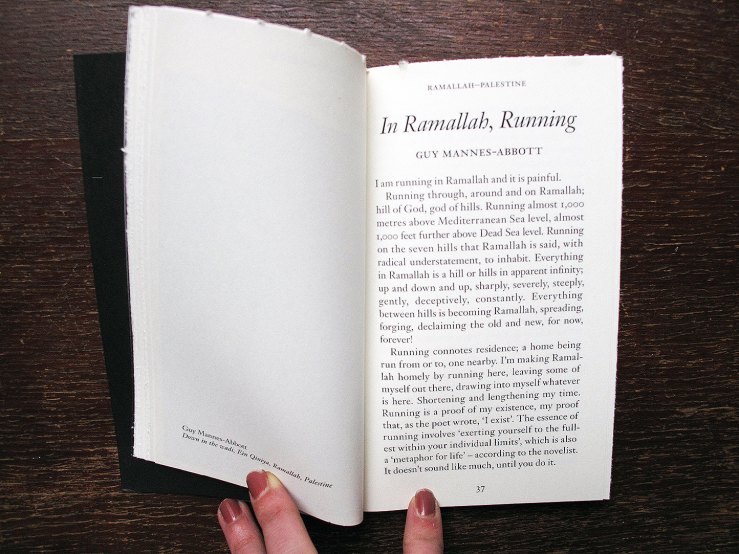 This is a tiny excerpt of the excerpt obviously. As a whole, my short running texts within Ramallah itself alternate with longer walking essays at/in/beyond the limits all around, which multiply and abstract in ways peculiar to this unique Occupation. Hence my attempt to reconjure the actual place, and actual people in their place. The whole text begins as it appears to do here, though this excerpt of 1500 words is made up only of running texts.