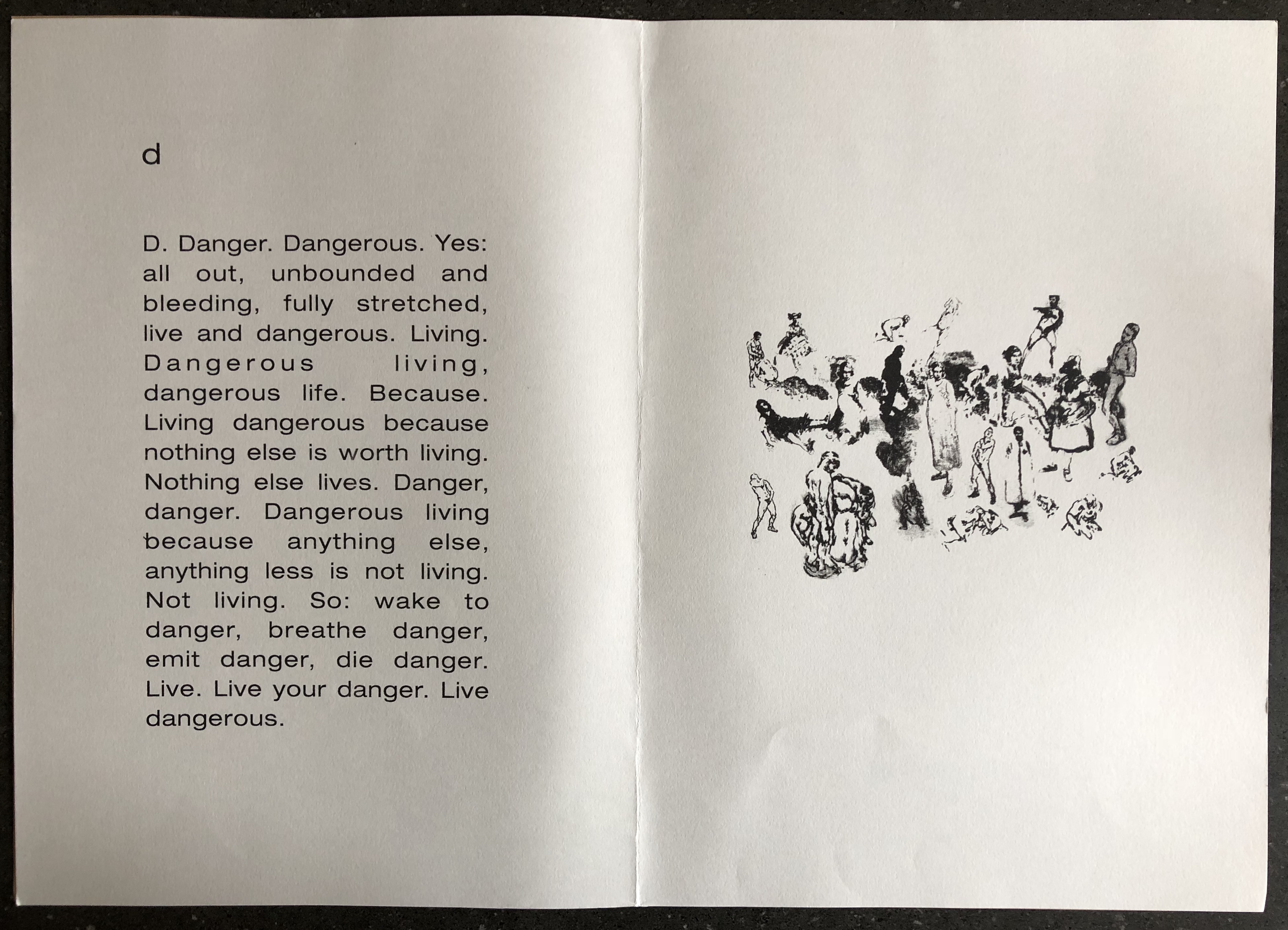 I meant a lot by this ‘living your danger’, mainly a writing understood as nothing less than art. I won’t prose-it-up now, but suffice to say that risk is all. Risk everything always, nothing else is worth clogging up the work or wasting anyone’s time with (especially a mind that thinks itself ‘well-stocked’; spend it, get out beyond its horizons before you start pulease!). Spend everything you know or think you know; don’t ‘save’ ideas, story, ‘material’, emotion, anything. Spend or work it and you discover what it is, for one thing, and its limits, but whatever it is also transforms in the process (ofc), and marks the world forever in its moment. Or that would be the minimal threshold, right? Of course, it means taking risks in everything else you do, too, but you know that.