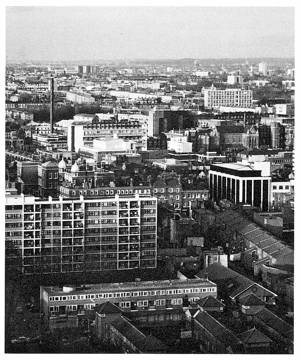 hills. Looking north-west along the communication lines, the eye follows the spikes of Hawksmoor’s Christchurch and the Truman Brewery chimney on Brick Lane itself, to St Leonard’s Church at Shoreditch just above the red roofs of the Boundary Street Estate – alongside the site of Shoreditch Fort. Immediately to the east is Sivill House, designed by the great Utopian architect and planner of London’s mid-century, Berthold Lubetkin. From Whitechapel’s helipad the top flanks of Sivill House reach skywards from Lubetkin’s Dorset Estate, with its two propeller-plan towers connected by a circular public library.